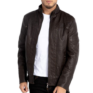 WULFUL Men's Vintage Stand Collar Leather Jacket